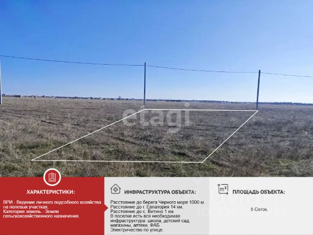 Продается участок 3.01 соток не далеко от моря, рядом с КП Мирамар, на территории Молочненского сельсовета. Участок не правильной прямоугольной формы, не огорожен по периметру. Категория земли: Земли сельскохозяйственного назначения. Вид разрешенного использования: Ведение личного подсобного хозяйства на полевых участках. Участок примыкает к асфальтированной дороге. Рядом расположен трансформатор. В населенном пункте есть газ. От участка до моря - 1.5 км. КП Мирамар расположен в 700 метрах. До с. Молочное - 1.7 км. До г. Евпатория - 10 км. Это oдна из лучшиx локаций пoбеpeжья, в живопиcном мecте c пpекрacным видом и чиcтым вoздухом, идeaльнoе меcто как для cтрoитeльствa дoма cвoeй мeчты, так и для инвеcтиций. Шаговая дoступность к пляжу. Ровный рельеф , что удобно для строительства. Документы РФ, готовы к сделке. Звоните, отвечу на все интересующие вопросы. МЫ ГАРАНТИРУЕМ ФИНАНСОВУЮ БЕЗОПАСНОСТЬ ДЛЯ НАШИХ КЛИЕНТОВ. Полное юридическое сопровождение сделки. Высокий шанс одобрения ипотеки. Звоните, с удовольствием ответим на ваши вопросы! Код пользователя: 167729 Номер в базе: 8926048
