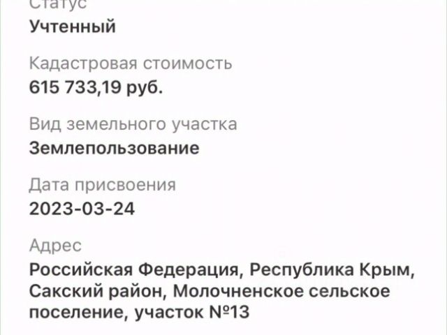 Продается участок 8сот в поселке Молочное. Категория земель: Земли населенных пунктов. Вид разрешенного использования : индивидуальное жилищное строительство (ИЖС). Все коммуникации рядом: свет, вода и газ. Дороги отсыпаны. Отлично подойдет для постоянного проживания или для гостиничного дома. Море на расстояние 2.5км. Массив быстро развивается и застраивается. В поселке есть школа, садик, магазины, аптеки. До г. Евпатории 10 км.