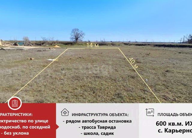 Продается земельный участок площадью 11.98 соток в селе Карьерное, предназначенный для капитального жилого строительства. Участок обладает выверенной прямоугольной формой, ровным рельефом и стратегически важным угловым расположением, что открывает потенциал не только для возведения частного дома, но и для размещения коммерческого объекта. Ключевым преимуществом является полная готовность к подключению инженерных сетей: магистрали электричества, водоснабжения и газа проходят непосредственно по границе территории, что значительно ускоряет и удешевляет процесс строительства. Инфраструктура поселка полностью сформирована и обеспечивает все потребности для постоянного проживания: в шаговой доступности находятся общеобразовательная школа, детский сад, сеть продуктовых и хозяйственных магазинов. Транспортная доступность обеспечена круглогодичным сообщением с городом. Территория благоустроена контейнерными площадками для сбора отходов, детскими игровыми комплексами и спортивной зоной с футбольным полем. Участок расположен в обжитом районе с постоянными соседями, что гарантирует спокойную и безопасную среду для жизни вашей семьи. Это рациональное решение для тех, кто ценит готовую инфраструктуру, развитые коммуникации и перспективы развития. Наша комиссия 79000 р.+1% от стоимости объекта, но не менее 70000 р. МЫ ГАРАНТИРУЕМ ФИНАНСОВУЮ БЕЗОПАСНОСТЬ ДЛЯ НАШИХ КЛИЕНТОВ. Полное юридическое сопровождение сделки. Высокий шанс одобрения ипотеки. Звоните, с удовольствием ответим на ваши вопросы! Код пользователя: 77621 Номер в базе: 3562340