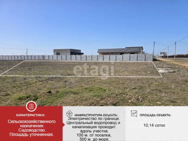 Продаётся земельный участок площадью 10 соток в СНТ Садовод -2007, рядом с пгт. Мирный, Сакский район. Расположен 810м от моря, 170 метров от озера Донузлав, и 29км от Евпатории. Категория земель: Земли населенных пунктов. Вид разрешенного использования: Размещение дачных домов и садовых домов. Документы РФ, готовы к продаже, межевание проведено. Участок правильной прямоугольной формы, огорожен бетонным евро забором, есть ворота. Коммуникации электричество заведено на участок, вода и канализация вдоль участка. Интернет. Село Поповка пользуется огромным спросом при выборе места отдыха на летний сезон. Подходит, как и для семейного отдыха, отдыха с друзьями, так и для постоянного проживания. Вся инфраструктура находится в 1 км от поселка в пгт. Мирный, а именно: школа, детский сад, магазины, рынки, аптеки и т.д. Самый большой фестиваль и семь больших танцполов на западном побережье находятся именно в Поповке. Пляж в Поповке считается самым лучшим на западном побережье: пляж шириной 100 метров, белый мелкий песок, пологий берег.
