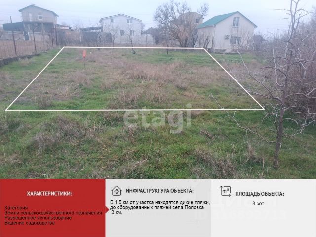Продаю дачный участок пгт. Мирный до города Евпатория 25 км. Это р-н с. Крыловка по дороге в пгт. Новоозерное. Участок 8 соток. Обработан и огорожен забором. Сделаны выдвижные ворота. Так же в продаже смежный участок. Прекрасное место под строительство дачи или дома, ВОЗМОЖНА ПРОПИСКА . На участке есть сарай для инструментов. Плодородные деревья: Гранат, Инжир, Смородина, Миндаль, Яблоки, Виноград и т.д. Вода есть на улице, возможно завести на участок. Электроэнергия - рядом столб . В дальнейшем обещают провести газ. На улице, по соседству с участком строятся дома. Рядом находятся лечебное озеро - 2 км и в 5 минутах находится Мирный, где хорошо развита городская инфраструктура. До Евпатории можно доехать на автомобиле за 30 минут. Документы готовы к продаже, земля в собственности. Звоните будем общаться. МЫ ГАРАНТИРУЕМ ФИНАНСОВУЮ БЕЗОПАСНОСТЬ ДЛЯ НАШИХ КЛИЕНТОВ. Полное юридическое сопровождение сделки. Высокий шанс одобрения ипотеки. Звоните, с удовольствием ответим на ваши вопросы! Код пользователя: 142149 Номер в базе: 9748681