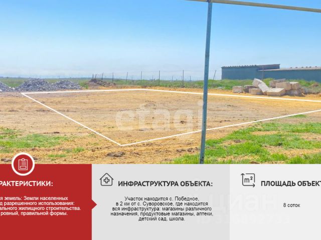 Продается участок, площадью 8 соток в с. Победное в 10 км от Евпатории! Категория земель: Земли населенных пунктов. Вид разрешенного использования: Для индивидуального жилищного строительства. Участок ровный, правильной формы. Участок находится с. Победное, в 2 км от с. Суворовское, где находится вся инфраструктура: магазины различного назначения, продуктовые магазины, аптеки, детский сад, школа. Звоните! МЫ ГАРАНТИРУЕМ ФИНАНСОВУЮ БЕЗОПАСНОСТЬ ДЛЯ НАШИХ КЛИЕНТОВ. Полное юридическое сопровождение сделки. Высокий шанс одобрения ипотеки. Звоните, с удовольствием ответим на ваши вопросы! Код пользователя: 167729 Номер в базе: 7060303