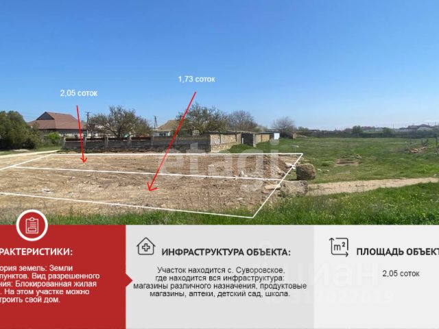 Участок 22 сотки под ИЖС и многоквартирную застройку расположен в Респ. Крым, Сакский район, с. Суворовское. Продается два перспективных земельных участка (два кадастровых номера) ПО ЦЕНЕ ОДНОГО для комплексного освоения в быстро развивающемся селе Суворовское. Для индивидуального жилищного строительства (ИЖС) и малоэтажной многоквартирной жилой застройки. Идеально для проекта таунхаусов, дуплексов или жилого дома на несколько семей. Позвоните нам, чтобы узнать все детали! Коммуникации: По границе участка проходят магистральные сети электроснабжения, водопровода, газ. Инфраструктура и расположение: Тихая, экологически чистая зона с развитой инфраструктурой. В селе есть магазины, школа, детский сад, фельдшерско-акушерский пункт. Удобный выезд на трассу, развитое автобусное сообщение. Близость к г. Саки и Евпатории (8 км). Перспективы: Район активно застраивается, высокий спрос на современное жилье. Отличная инвестиция для застройщиков. Цена: 10 000 000 за весь участок. Возможен торг для серьезного покупателя. Документы проверены юристами и готовы к сделке. Профессиональное сопровождение до получения права собственности. Добавьте предложение в закладки, чтобы не потерять! Купить земельный участок на улице Евпаторийская в селе Суворовское.