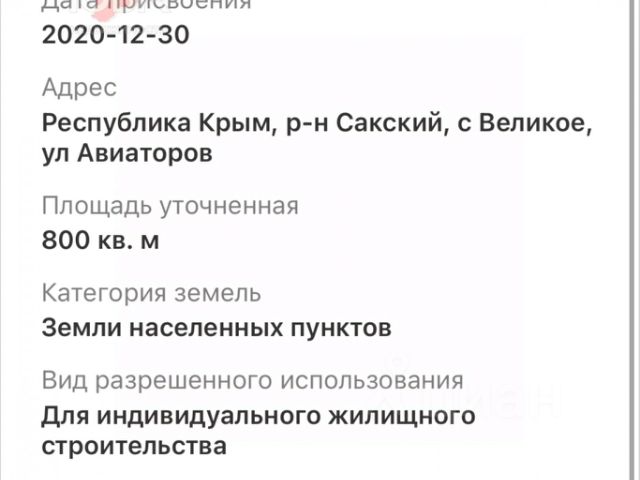Продается участок ИЖС ( 8 соток) в живописном районе, в селе Великое, Сакского района. Кадастровый номер участка 90:11:210201:1489,что гарантирует его юридическую чистоту. Участок ровный, прямоугольной формы, отмежеванный, предлагает отличные перспективы для строительства вашего дома мечты. Коммуникации: свет, вода возможно подключение, что комфортно для проживания. Расстояние до города-курорта Евпатория 6км; расстояние до моря 12 км; расстояние до трассы Таврида 3,6 км. Номер объекта: #1/545754/23345