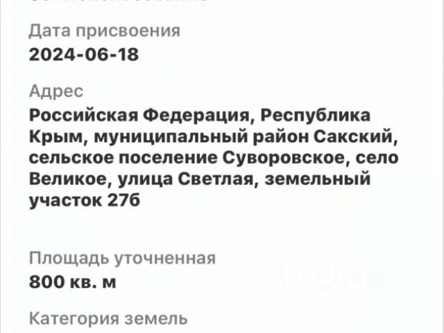 Продается участок для строительства в Сакском районе с. Великое площадью 10 соток. Расстояние от города Евпатория 15км. Есть электричество, центральное водоснабжение, газ. Рядом автодорога. Участок очищен от кустарников. уплотнен, готов к застройке. При звонке сообщите нам, пожалуйста, номер: Z3832