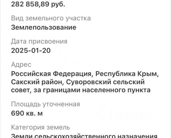 Небольшой земельный участок сельхоз назначения для ЛПХ на полевых условиях за пределами населенного пункта (кадастровый номер: 90:11:130701:2578). Участок расположен в Сакском районе между поселением прибрежное и Евпаторией, недалеко от памятника Евпатоскому десанту. Уникальность данного участка в максимальной близости к морю и соленому розовому озеру Сасык.