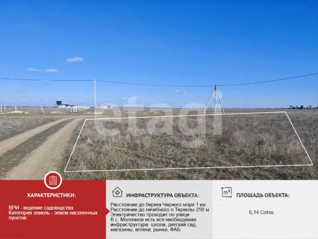Продам участок в СОК "Орбита", всего 10 км. от центра Курортного г. Евпатория! Участок 5 соток, ровный! Центральное водоснабжение, подключения электричества в процессе, техусловия получено! Межевание проведено, установлены границы! До песчаного пляжа 1 км., пешим ходом 10 минут! Документы готовы к сделке! Звоните!