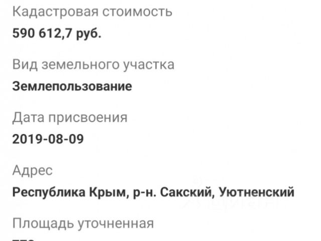 **Продажа земельного участка в селе Уютное, Республика Крым** Прекрасная возможность приобрести земельный участок в живописном селе Уютное, расположенном на окраине Евпатории! Этот участок, предназначенный для индивидуального жилищного строительства (ИЖС), станет идеальным местом для проживания и создания комфортного дома. Участок имеет кадастровый номер и расположен в быстро развивающемся районе с отличной инфраструктурой. В шаговой доступности находятся школа, детский сад, аптеки и супермаркеты, что обеспечит вас всем необходимым для комфортной жизни. С участка открывается великолепный вид на город, который будет радовать вас каждый день. Грунтовая дорога приведет вас к вашему будущему дому. Электричество (380 В) уже подведено к участку, что избавит вас от лишних хлопот при строительстве. Не упустите шанс стать владельцем этого уникального участка в Крыму! Звоните прямо сейчас, чтобы узнать подробности и записаться на просмотр!