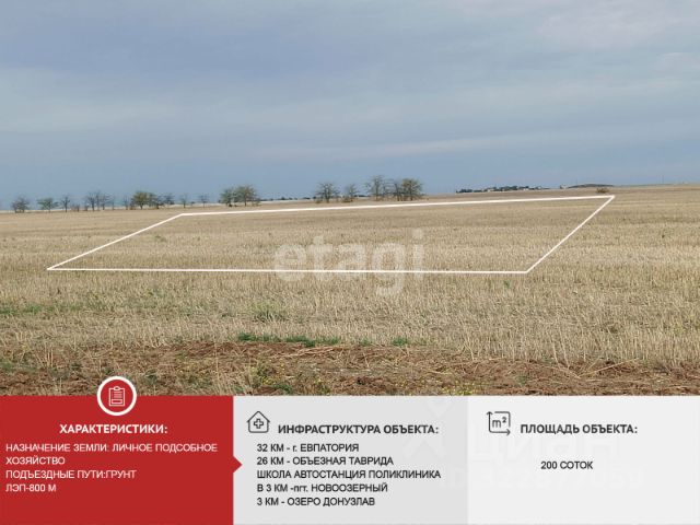 Продам земельный участок , расположенный в Сакском районе, Веселовском сельском поселении. Участок ровный, прямоугольной формы площадью 200 соток. Категория земель: Земли сельскохозяйственного назначения Назначение земли:Ведение личного подсобного хозяйства на полевых участках. С участка открываается шикарный вид на озеро Донузлав! Коммуникации: Электричество - до столбов 800 м, вода - пробурить скважину. Расстояние до поселка Новоозерное ровно 3км. В поселке есть вся необходимая инфраструктура: школа, детский сад, магазины, поликлиника, автостанция. Хорошее вложение для инвестиций. Земля в Крыму только дорожает! Ее не производят! Подходит под все формы оплаты! Звоните! Ответим на все ваши вопросы и организуем показ! МЫ ГАРАНТИРУЕМ ФИНАНСОВУЮ БЕЗОПАСНОСТЬ ДЛЯ НАШИХ КЛИЕНТОВ. Полное юридическое сопровождение сделки. Высокий шанс одобрения ипотеки. Звоните, с удовольствием ответим на ваши вопросы! Код пользователя: 145644 Номер в базе: 9983546