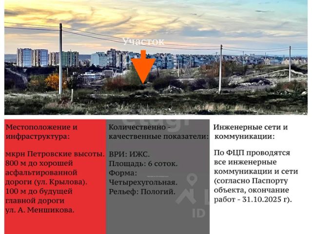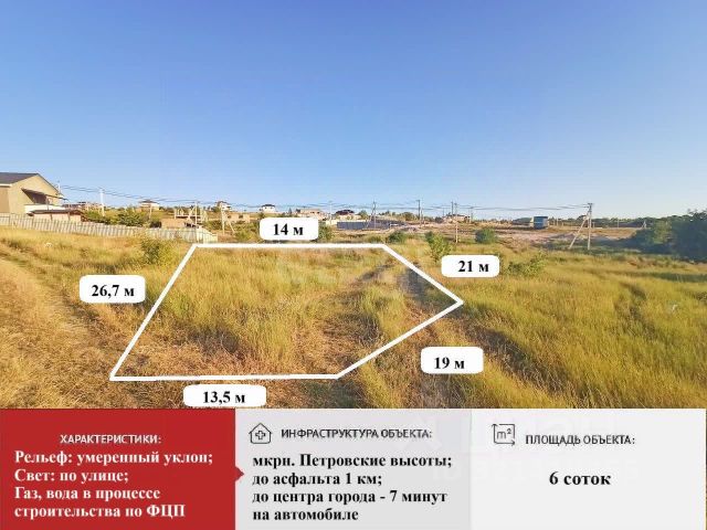 Продается участок 6 соток в перспективном районе Петровские Высоты по привлекательной цене! Продается уникальный участок в быстроразвивающемся районе Петровские Высоты — это ваш шанс воплотить мечту о собственном доме или выгодном инвестиционном проекте! Площадь 6 соток, категория ИЖС, идеально подходит для строительства жилья, где комфорт городской жизни гармонично сочетается с красотой природы. На участке уже ведутся работы по подключению электричества, воды, газа и канализации, завершение планируется в 2025-2026 годах. Это значит, что вы сможете быстро и без лишних хлопот начать строительство своего идеального жилья. Петровские Высоты — это не просто участок, а часть глобального плана развития территории, который включает строительство школы, детского сада, стадиона и благоустроенных общественных пространств. Асфальтированные дороги и смотровые площадки сделают этот район еще более комфортным для жизни и отдыха. Соседние участки уже активно застраиваются, что свидетельствует о растущем интересе к этому месту. Дорога к участку грунтовая, всего 100 метров до асфальта, что обеспечивает удобный доступ. Отличное инвестиционное вложение! . Звоните! Организую показ! При необходимости, поможем одобрить ипотеку! Полное сопровождение сделки! Номер объекта: 4495248 МЫ ГАРАНТИРУЕМ ФИНАНСОВУЮ БЕЗОПАСНОСТЬ ДЛЯ НАШИХ КЛИЕНТОВ. Полное юридическое сопровождение сделки. Высокий шанс одобрения ипотеки. Звоните, с удовольствием ответим на ваши вопросы! Код пользователя: 181553 Номер в базе: 4495248