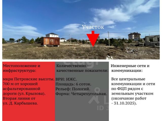 Земельный участок, площадью 809 кв. м, расположен в активно развивающемся районе "Петровские высоты". Участок характеризуется минимальным уклоном, что упрощает и удешевляет будущее строительство. Ключевые коммуникации уже обеспечены: электричество находится в стадии подключения, оплата произведена, а трубы водоснабжения и водоотведения проложены по границе территории. Подключение к водопроводу планируется в декабре текущего года, а газификация участка запланирована в рамках федеральной программы на 2026 год. Участок обладает всеми необходимыми документами, готов к сделке и может быть приобретен в ипотеку. Местоположение является одним из ключевых преимуществ: до центра Симферополя всего 5 км, что обеспечивает отличную транспортную доступность при сохранении спокойной атмосферы. Расстояние до моря в направлениях Алушты и Николаевки составляет 45 км. Подъезд к участку осуществляется по щебеночной дороге, расстояние до асфальтированного покрытия на улице Крылова — 200 метров. Район отличается живописными видами на лесные массивы и горы. Перспективы развития территории подкреплены комплексным планом застройки, который включает строительство социальной инфраструктуры — школы, детского сада, стадиона, а также асфальтирование дорог и обустройство смотровых площадок. Активное строительство домов на соседних участках подтверждает востребованность и инвестиционную привлекательность локации. Данный участок представляет собой рациональный выбор для тех, кто планирует строительство собственного дома с расчетом на будущее развитие инфраструктуры, а также для долгосрочных капиталовложений. Для более детальной информации, звоните! Номер объекта: 9869902 МЫ ГАРАНТИРУЕМ ФИНАНСОВУЮ БЕЗОПАСНОСТЬ ДЛЯ НАШИХ КЛИЕНТОВ. Полное юридическое сопровождение сделки. Высокий шанс одобрения ипотеки. Звоните, с удовольствием ответим на ваши вопросы! Код пользователя: 181553 Номер в базе: 9869902