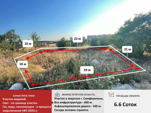 В продаже видовой участок, площадью 6 соток, расположен в развивающемся микрорайоне Петровские высоты в 5 км от центра Симферополя, что гарантирует отличную транспортную доступность и быстрый выезд на основные трассы. Ключевое преимущество — полное подведение всех центральных коммуникаций: электричества, водоснабжения, газа и канализации, которое будет завершено в 2025 году, что позволяет незамедлительно приступить к строительству после оформления сделки. Подъезд к участку осуществляется по грунтовой дороге, расстояние до асфальтированного покрытия составляет 400 метров. В рамках комплексного развития территории запланировано создание полноценной социальной инфраструктуры, включая школу, детский сад, стадион и смотровые площадки, а также благоустройство общественных зон и асфальтирование дорог. Активное строительство на соседних участках подтверждает высокий спрос и инвестиционный потенциал локации. Объект идеально подходит для возведения частного дома с постоянным проживанием или для капиталовложений с расчетом на рост стоимости в ближайшей перспективе. Номер объекта: 10010004. МЫ ГАРАНТИРУЕМ ФИНАНСОВУЮ БЕЗОПАСНОСТЬ ДЛЯ НАШИХ КЛИЕНТОВ. Полное юридическое сопровождение сделки. Высокий шанс одобрения ипотеки. Звоните, с удовольствием ответим на ваши вопросы! Код пользователя: 150396 Номер в базе: 10010004