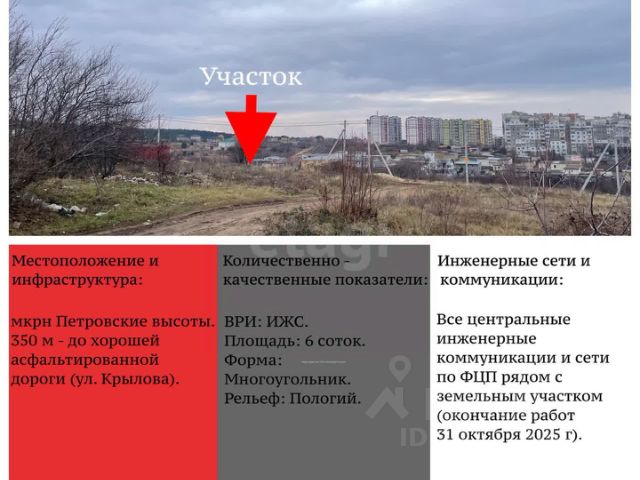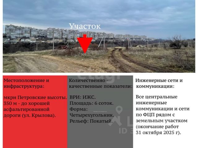 Участок в лучшем районе Симферополя — "Петровские высоты"! Преимущества предложения: Инвестиционная привлекательность и перспективное развитие: "Петровские высоты" — активно развивающийся квартал с инфраструктурой, утверждённой к 2025 году. Здесь появятся школы, детские сады, кинотеатр, магазины, кафе и офисы. Ваш дом будет окружен всеми необходимыми удобствами! Шикарное местоположение с панорамным видом: Участок находится на возвышенности, что позволяет наслаждаться великолепными видами на город прямо из вашего будущего дома. Готовность коммуникаций: По проекту все коммуникации (свет, газ, вода, канализация) будут проведены, что облегчает процесс строительства и экономит ваше время. Ровная поверхность и удобные размеры: участок прекрасно подходит для реализации любых архитектурных задумок. Удобный выезд к городской инфраструктуре: Всего в трёх минутах асфальтированная дорога на ул.Крылова, а рядом уже проживают соседи, создавая комфортное и обжитое окружение. Если вы ищете место для строительства дома своей мечты, где есть сочетание уединения и городской инфраструктуры — этот участок для вас! Кадастровый номер: 90:22:010315:266 Есть торг для реального покупателя. ДОБАВЬТЕ ОБЪЯВЛЕНИЕ В ИЗБРАННОЕ, ЧТОБЫ НЕ ПОТЕРЯТЬ!