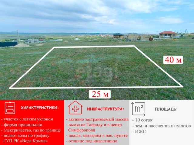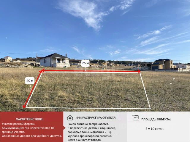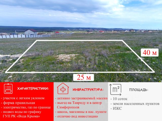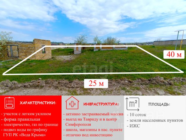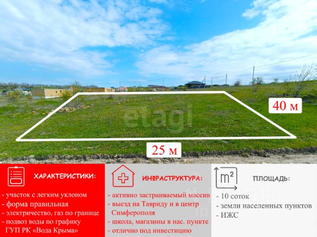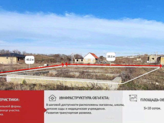 Участок, площадью 10 соток, расположен в селе Левадки и предлагает уникальную возможность для строительства частного дома в живописной местности с панорамным видом на долину. Территория характеризуется ровным рельефом и правильной прямоугольной конфигурацией, что оптимизирует планировку и снижает затраты на подготовительные строительные работы. К участку уже подведено электричество 15 кВт, ведутся работы по газификации, а завершение подключения к центральному водоснабжению планируется к концу 2025 года. Удобная транспортная доступность обеспечивается за счет близости асфальтированной дороги — всего 800 метров, а регулярное сообщение с городом осуществляется через маршруты общественного транспорта. Микрорайон активно развивается в рамках федеральной программы, которая включает строительство новой школы, детского сада и комплексное асфальтирование улиц. Данный объект представляет собой выгодное капиталовложение как для собственного проживания, так и для дальнейшего развития территории. Номер объекта для ознакомления: 9698740. МЫ ГАРАНТИРУЕМ ФИНАНСОВУЮ БЕЗОПАСНОСТЬ ДЛЯ НАШИХ КЛИЕНТОВ. Полное юридическое сопровождение сделки. Высокий шанс одобрения ипотеки. Звоните, с удовольствием ответим на ваши вопросы! Код пользователя: 189436 Номер в базе: 9698740 Земельный участок в селе Левадки Симферопольского района.