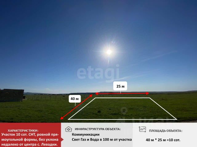 **Участок- 10 соток — ваш уголок природы всего в нескольких минутах от города!** Симферопольский р-н, на территории Чистенского сельского совета, в районе с. Левадки. Вы мечтаете о спокойствии, свежем воздухе и живописных пейзажах? Этот участок — идеальное решение для вас! **Живописное место** — этот участок предлагает вам уникальную возможность насладиться красотой природы. Чистый воздух и потрясающие виды сделают каждый ваш день особенным. Здесь вы сможете забыть о городской суете и насладиться тишиной и спокойствием. **Развитая инфраструктура** — электричество находится в непосредственной близости от участка, а в ближайшее время планируется подключение центрального водопровода. Асфальтированные дороги обеспечат вам удобный доступ к вашему новому участку, что делает его идеальным местом для строительства вашего загородного дома. **Не упустите свой шанс!** Этот участок — не просто земля, это возможность создать свой уголок счастья и уединения. Не упустите шанс стать владельцем участка в одном из самых уютных и живописных мест! Звоните и бронируйте свой участок уже сегодня! Номер объекта: 6789741. Ваш идеальный загородный дом ждет вас! МЫ ГАРАНТИРУЕМ ФИНАНСОВУЮ БЕЗОПАСНОСТЬ ДЛЯ НАШИХ КЛИЕНТОВ. Полное юридическое сопровождение сделки. Высокий шанс одобрения ипотеки. Звоните, с удовольствием ответим на ваши вопросы! Код пользователя: 142788 Номер в базе: 6789741