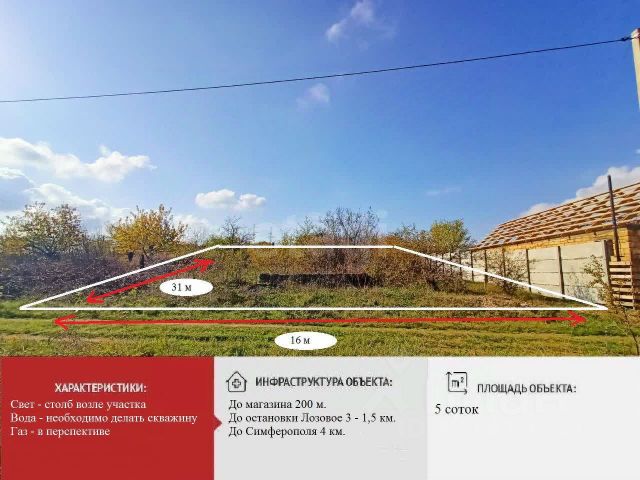 Арт. 101641036 Пространство этого райского уголка, площадью 976 кв.м. позволяет уйти от шума мегаполиса и погрузиться в мир, где гармонично сочетаются все блага цивилизации и природа. Идеальное Пространство для строительства своего Дома для Жизни в Козырном Месте с возможностью прописки!! Эта земля - Единственный не застроенный участок здесь из первых рук! Видовой! Люксовый! В Безопасном Красивом и экологически чистом месте полуострова Крым, расположенном в 1 км от Симферополя в СНТ "Энергия", в 15 минутах ходьбы от остановки "Лозовое-3", на трассе Ялта - Симферополь. Земли сельскохозяйственного назначения, ведение садоводства. Участок расчищен под застройку, без построек и насаждений, с хорошим подъездом с трёх сторон, ровный, прямоугольный со множеством "плюшек". Со всех сторон живут соседи. В СНТ есть все коммуникации: газ; вода; электричество(столб прямо у ворот), интернет. Лучшее место для жизни и отдыха с прекрасной экологией, в окружении лесного массива, наполненного пением птиц и живыми звуками природы, вблизи Целебного источника. Интеллигентные добропорядочные соседи создают благодатную среду для жизни и общения. В пешей доступности развитая инфраструктура. Свободная продажа. Обременений нет. Все документы РФ. Сделка пройдёт быстро. Один собственник. Для Вас полное юридическое сопровождение сделки на высшем уровне. Покупайте! Можно в ипотеку. Здесь Вы будете здоровы и счастливы!