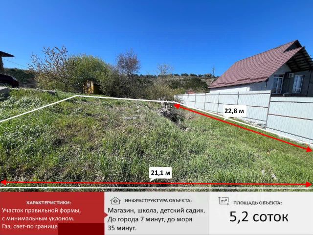 Ровный участок, правильной прямоугольной формы - 5 соток, на территории участка возведено трехэтажное строение 6х5 метров, 2 этажа из камня, третий из ракушечника. Газ и электричество проходят по границе участка. Вода: можно пробурить скважину ( у соседей 1-3 м3 в сутки). Обжитое место, соседи построились и проживают постоянно. Документы Российского образца