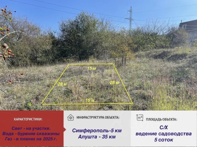 Продается участок в пригороде Симферополя! Предлагаем вашему вниманию участок площадью 5 соток в живописном районе, всего в 10 минутах от города и 40 минутах до моря. Участок ровный, правильной формы, что делает его идеальным для строительства вашего будущего дома. • Коммуникации: Свет по границе, газ доступен в СНТ. • Документы: Все готово к сделке. • Преимущества: Отличный вид, свежий воздух и комфортная атмосфера для жизни. Не упустите возможность создать свой уютный уголок! Звоните для получения дополнительной информации и организации просмотра. Номер объекта: 5871924 МЫ ГАРАНТИРУЕМ ФИНАНСОВУЮ БЕЗОПАСНОСТЬ ДЛЯ НАШИХ КЛИЕНТОВ. Полное юридическое сопровождение сделки. Высокий шанс одобрения ипотеки. Звоните, с удовольствием ответим на ваши вопросы! Код пользователя: 92806 Номер в базе: 5871924