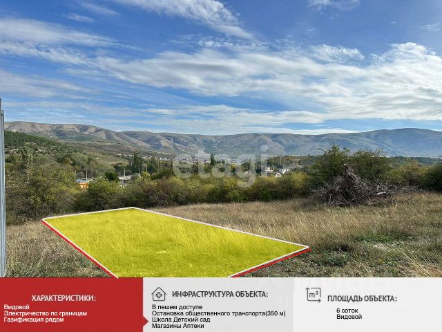 Код объекта: 1655372. Продается земельный участок! Если вы ищете участок земли в живописнои долине Крыма, то это предложение для вас! Мы предлагаем к продаже видовои земельныи участок в Долине, которая находится рядом с Красными пещерами и Парком Викингов. Это идеальное место для тех, кто любит природу и хочет наслаждаться красивыми видами на горы и долины. Участок расположен на высоте 800 метров над уровнем моря, что обеспечивает отличныи вид на окружающую природу. Здесь вы сможете наслаждаться чистым горным воздухом и красивыми закатами. Площадь участка составляет 6 соток, что достаточно для строительства дома или дачи. Участок находится в частнои собственности и имеет все необходимые документы. Кроме того, Долина, где находится участок, славится своими природными ресурсами. Здесь можно наити множество растении и животных, а также посетить местные достопримечательности, такие как Красные пещеры и водопады. Если вы хотите купить участок земли в живописном месте, то этот вариант идеально подоидет для вас. Свяжитесь с нами, чтобы узнать больше о продаже видового земельного участка и получить подробную информацию!