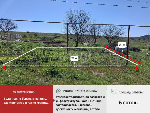 Участок, ИЖС, в экологическом районе,с.Пионерское! Предлагаем приобрести земельный участок, 6 соток. Правильной формы, ровный. Коммуникации: вода-нужно бурить скважину, электричество и газ по границе. Развитая транспортная развязка и инфраструктура. Район активно застраивается. В шаговой доступности магазины, аптеки. До Симферополя 5 км., до моря на авто 30 минут. Звоните нам прямо сейчас, и мы организуем показ участка в удобное для вас время. Не упустите уникальный шанс стать обладателем этого участка мечты! Номер объекта:7723450 МЫ ГАРАНТИРУЕМ ФИНАНСОВУЮ БЕЗОПАСНОСТЬ ДЛЯ НАШИХ КЛИЕНТОВ. Полное юридическое сопровождение сделки. Высокий шанс одобрения ипотеки. Звоните, с удовольствием ответим на ваши вопросы! Код пользователя: 126636 Номер в базе: 7723450