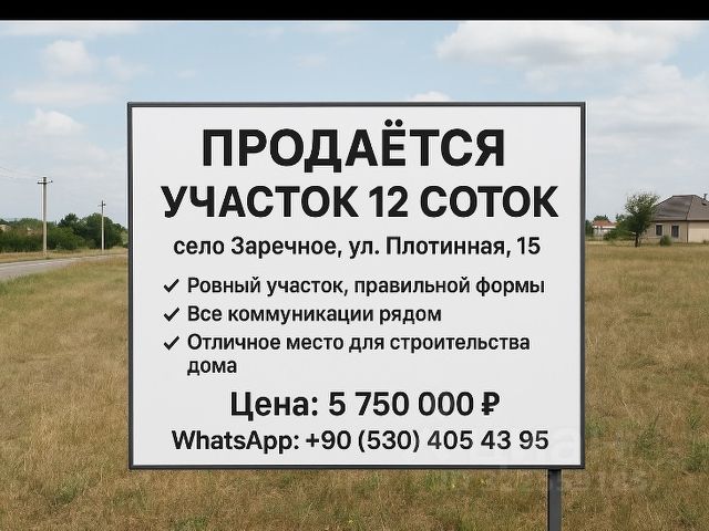 Продается земельный участок в Заречном! Основные характеристики: - Площадь: 11.4 соток (ИЖС — индивидуальное жилищное строительство). - Фасад: 23 метра. - Расположение: Первая улица от трассы, рядом с новой автодорогой "Таврида". Инфраструктура и удобства: - В 5 минутах ходьбы — вся необходимая инфраструктура (магазины, школы, больницы и т.д.). - Газ и свет подведены по границе участка. Дополнительно на участке: - Домик площадью 30 кв. м (из ракушки) — можно обустроить для проживания или использовать как склад стройматериалов во время строительства. - Уличный туалет. Пишите или звоните — организуем быстрый показ! Продам земельный участок на улице Плотинная в селе Заречное в сельском поселении Добровское.