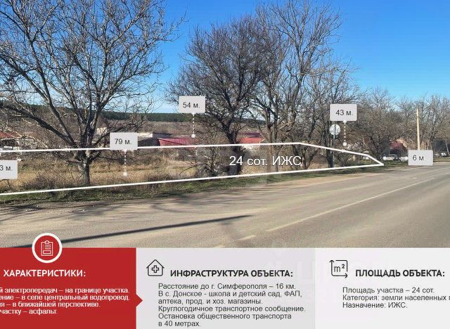 Продается участок отличный вариант Инвестирования! Место расположения: с. Донское, Симферопольский район. Расстояние до г. Симферополь (центр) 14 км, время в пути на автомобиле 25 минут, по автомобильной трассе федерального значения Таврида. Категория земель участка земли населенных пунктов, предназначен для индивидуального жилищного строительства. Площадь участка 24 сотки. Участок ровный, сухой, угловой, с возможностью организации двухстороннего подъезда, свободен от построек и насаждений. Подъезд к участку - асфальт. Коммуникации: сети электропередач по границе участка, водоснабжение в селе - централизованное, газификация района в ближайшей перспективе (2025-2026 год). Остановка общественного транспорта в пешей доступности (200 метров), осуществляются регулярные пассажирские перевозки, транспорт ходит по расписанию. В селе функционируют общеобразовательные учреждения средняя школа, детский сад, ФАП, продуктовые и хозяйственные магазины, отделение почты, сельский клуб, пункты доставки товаров. Приобретая этот участок, Вы совершите выгодное вложение, данный объект, подойдет и для индивидуального строительства, и для малой жилой застройки. Заинтересовало предложение? Звоните, ответим на все интересующие Вас вопросы, организуем быстрый показ! Номер объекта 4407734. МЫ ГАРАНТИРУЕМ ФИНАНСОВУЮ БЕЗОПАСНОСТЬ ДЛЯ НАШИХ КЛИЕНТОВ. Полное юридическое сопровождение сделки. Высокий шанс одобрения ипотеки. Звоните, с удовольствием ответим на ваши вопросы! Код пользователя: 92806 Номер в базе: 4407734 Купить земельный участок на улице Фонтанная в селе Донское.