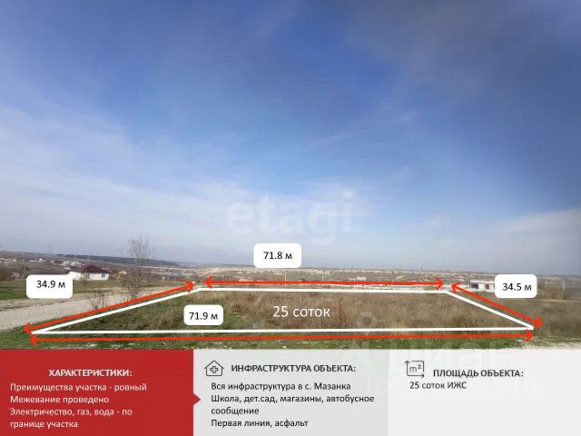 ОБРАТИТЕ ВНИМАНИЕ Продается участок 25 соток в селе Мазанка в первой линии!! Прямоугольный участок площадью 25 соток с межеванием расположен в селе Мазанка на улице Скалистая. Участок характеризуется ровным рельефом и протяженным фасадом вдоль дороги протяженностью 71 метр, что открывает широкие возможности для проектирования. Все центральные коммуникации — электричество, газ и водопровод — проходят вдоль территории, что значительно упрощает и удешевляет процесс подключения будущего объекта. Подъездная дорога с асфальтовым покрытием обеспечивает круглогодичную доступность. Удобное расположение в непосредственной близости от выезда на федеральную трассу "Таврида" обеспечивает отличную транспортную связность с Симферополем и другими городами Крыма. Данные параметры делают участок универсальным решением как для возведения капитального жилого дома для постоянного проживания, так и для реализации коммерческих проектов, ориентированных на поток транзитных путешественников. Участок полностью подготовлен к началу строительных работ. Наверняка это то, что Вы искали, свяжитесь с нами! Компания "ЭТАЖИ" - лучшее решение для покупателей! Звоните пока предложение актуально Номер объекта: 10305093 МЫ ГАРАНТИРУЕМ ФИНАНСОВУЮ БЕЗОПАСНОСТЬ ДЛЯ НАШИХ КЛИЕНТОВ. Полное юридическое сопровождение сделки. Высокий шанс одобрения ипотеки. Звоните, с удовольствием ответим на ваши вопросы! Код пользователя: 161152 Номер в базе: 10305093