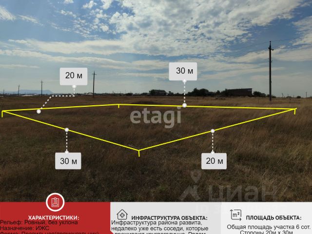 Предлагаю вашему вниманию ровный участок, площадью 6 соток, прямоугольной формы в Мирном! В массиве идет активная застройка, так как его расположение пользуется огромным спросом. Земля - чернозем. Отличное расположение, удобный подъезд к участку. Коммуникации: электричество - по границе. Вода скважина около 30м! Улица широкая! Размер Фасада 20м, размер боковой части 30м. Вблизи находится вся необходимая инфраструктура Симферополя, помимо этого в поселке уже утвердили строительство Школы на площади 3 га., строительство детского сада и амбулатории на площади 1 га. А так же выделена земля для коммерческого назначения, где будут расположены: аптеки, магазины, автомагазины, общепит и многое другое! Помощь в оформлении и полное сопровождение сделки! Документы в полном порядке и готовы к сделке! Звоните и организую оперативный показ!