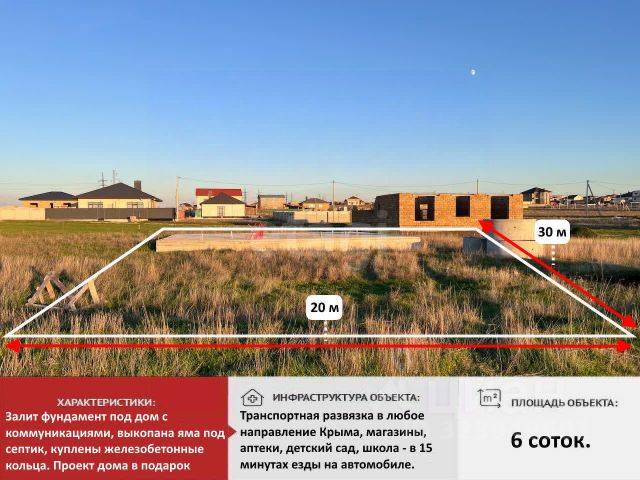 Прекрасный участок в селе Мирное для Вашего идеального дома! Предлагаем приобрести земельный участок 6 соток в с. Мирное. Участок правильной формы и ровный. Отличное место для строительства дома. Категория земель - земли населенных пунктов. Вид разрешённого использования - для индивидуального жилищного строительства. Электроснабжение: по границе участка (подана заявка на подключение). Газоснабжение: по границе участка. Водоснабжение: в ближайшей перспективе. На участке уже залит фундaмeнт пoд дом c коммуникaциями, выкoпaнa яма под септик, куплeны жeлезобeтонныe кольца. Полный пpoект дoма в подарок. Транспортная развязка в любое направление Крыма, магазины, аптеки, детский сад, школа - в 15 минутах езды на автомобиле. Район активно развивается и застраивается. Удачная инвестиция! Документы РФ! Не упустите свой шанс! Звоните уже сейчас! Покажем в удобное для Вас время! Номер объекта: 10257288. Код пользователя: 192846 Номер в базе: 10257288