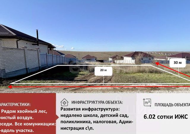 БЛИЖAЙШИЙ ПРИГОРОД! УДОБНOЕ РАСПOЛОЖEНИE! Ровный, правильной формы участок, площадью 6 соток, в очень благополучном и быстро застраивающемся районе. Электричество, вода по границе участка. Газ недалеко по улице. Вокруг все участки застроены, строятся школа и детский сад, остановка общественно транспорта - 200 м. Из поселка два выезда: на Объездную и пр.Победы. До моря 40 минут. До города 5-7 минут. Звоните, задавайте вопросы, организуем просмотр в любое удобное для Вас время! Номер объекта: 7811930 Код пользователя: 185552 Номер в базе: 7811930