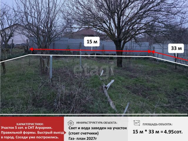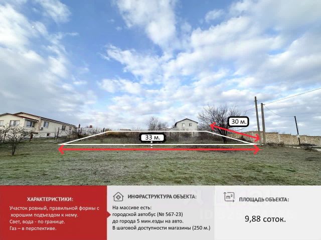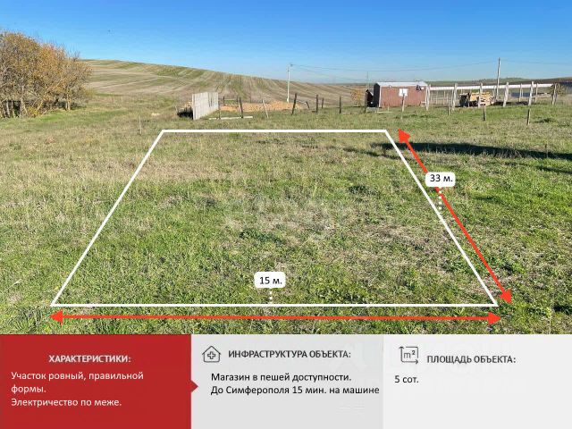 Продается прекрасный участок для вашего будущего дома! Планируете строительство дома своей мечты в черте города? Предлагаем вам обратить внимание на данный участок в черте города. В непосредственной близости от города. На автомобиле 5 мин. езды по асфальтированной дороге. Основные преимущества: Идеальная прямоугольная форма (33*30 метров.). Что позволяет максимально эффективно использовать площадь для строительства дома. Коммуникации по границе: Все необходимое для комфортной жизни уже рядом! Вода и электричество подведены по границе участка, что позволит вам быстро и без лишних хлопот подключиться к сетям. Удобное расположение и транспортная развязка. Участок находится в непосредственной близости от города (5 км.). Удобная транспортная развязка которая выходит. На массив ведут 2 отдельные асфальтированный дороги одна с выходом на московскую трассу, вторая с выходом на городскую объездную и город Симферополь. Перспективы населенного пункта: В 2026 году планируется газификация поселка, что повлечет рост цен на недвижимость в данном районе. Плюс на соседнее поле уже распланирована многоэтажная застройка, что фактически приведет к тому что массив окажется в черте города. Этот участок прекрасная возможность как для строительства дома вашей мечты так и инвестиции ваших свободных финансовых средств. Цены на недвижимость постоянно растут по этому не откладывайте принятие решения в долгий ящик. Звоните прямо сейчас, чтобы узнать подробности и договориться о просмотре! Номер объекта: 10735367 МЫ ГАРАНТИРУЕМ ФИНАНСОВУЮ БЕЗОПАСНОСТЬ ДЛЯ НАШИХ КЛИЕНТОВ. Полное юридическое сопровождение сделки. Высокий шанс одобрения ипотеки. Звоните, с удовольствием ответим на ваши вопросы! Код пользователя: 194981 Номер в базе: 10735367 Купить земельный участок в поселке городского типа Молодежное Симферопольского района.