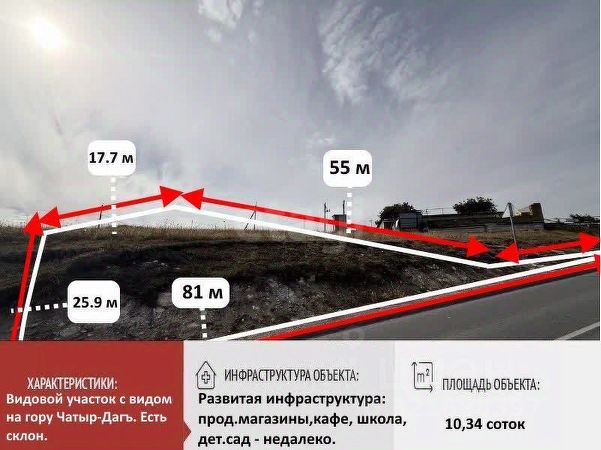 Предлагаем Вашему вниманию участок с потрясающим видом на гору Чатыр-Даг и заповедную дубовую рощу! ! ВРИ - Садоводство, поэтому возможно построить ЖИЛОЙ ДОМ! Можно как коммерцию использовать, так как первая линия от асфальта. Заезд на участок возможен: с асфальтированной улицы снизу, по пути на Залесье. Участок с естественным уклоном и неперекрываемым видом на горы! КОММУНИКАЦИИ (централизованные): электроснабжение по границе; водоснабжение вдоль дороги; РАЗВИТАЯ ИНФРАСТРУКТУРА: продуктовые магазины, мясной Халяль, хоз.товары, кафе-бургерная, автозапчасти, аптека, Икея, автомойка, школа, спортивные площадки, дет.сад, футбольное поле через дорогу; - в 100 метрах остановка общественного транспорта; - новая асфальтированная дорога. ХОРОШАЯ ТРАНСПОРТНАЯ ДОСТУПНОСТЬ: - центральный район Симферополя рядом, - недалеко Залесский рынок и восточный автовокзал, - удобные выезды во все стороны Крыма - рядом а/д Таврида и Объездная дорога. Продаются только ДВА СМЕЖНЫХ ЗЕМЕЛЬНЫХ УЧАСТКА вместе. Звоните или пишите — с удовольствием отвечу на все вопросы и организую показ! Номер объекта : 9825277 МЫ ГАРАНТИРУЕМ ФИНАНСОВУЮ БЕЗОПАСНОСТЬ ДЛЯ НАШИХ КЛИЕНТОВ. Полное юридическое сопровождение сделки. Высокий шанс одобрения ипотеки. Звоните, с удовольствием ответим на ваши вопросы! Код пользователя: 185557 Номер в базе: 9825277