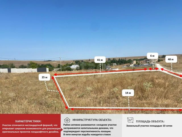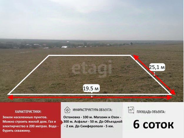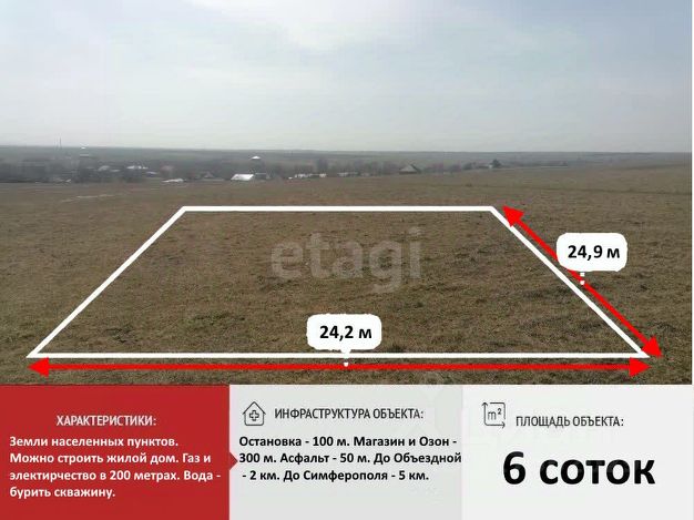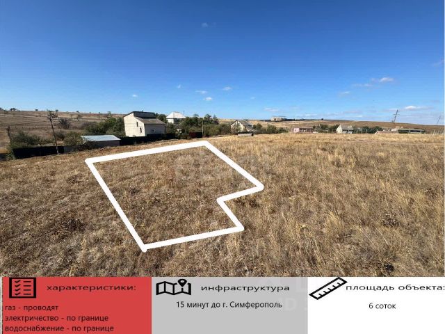 Ровный участок площадью 6 соток, подходит для строительства жилого дома и комфортного проживания. Коммуникации: • газ проходит по селу; • электрические сети расположены рядом с участком; • централизованного водоснабжения нет, по информации от соседей водоносный слой находится примерно на глубине 35 метров. Расположение: • тихое и спокойное место; • чистый воздух; • удобный выезд в Симферополь; • до центра города — около 20 минут на автомобиле; • до ближайшего пляжа — около 40 км. Возможна рассрочка, условия обсуждаются индивидуально. Кадастровый номер: 90:12:131901:3094 Купить земельный участок в селе Ключи Симферопольского района.