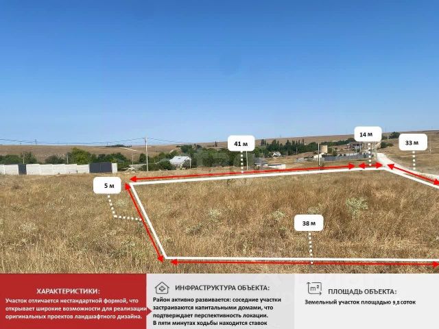 Земельный участок, площадью 9,8 соток, с разрешенным использованием под ИЖС, расположен в селе Ключи — одном из самых перспективных пригородов Симферополя. Удачное расположение обеспечивает быстрый доступ к инфраструктуре города: до центра всего 14 км по асфальтированной дороге, что занимает 1015 минут на автомобиле. До пляжей Черного моря в посёлке Николаевка можно добраться за 2025 минут (29 км), что делает участок привлекательным как для постоянного проживания, так и для сезонного отдыха. Участок отличается нестандартной формой, что открывает широкие возможности для реализации оригинальных проектов ландшафтного дизайна. Рельеф позволяет организовать панорамную террасу с видами на предгорье, зонировать пространство под жилую застройку, сад и парковочные места. Подъезд к участку асфальтированный, что гарантирует удобный доступ в любое время года. Электроснабжение обеспечивается столбом линии электропередач по границе участка с возможностью подключения. Водоснабжение доступно через централизованный водопровод села, а при необходимости можно пробурить индивидуальную артезианскую скважину. Район активно развивается: соседние участки застраиваются капитальными домами, что подтверждает перспективность локации. В пяти минутах ходьбы находится ставок, где можно заниматься рыбалкой или наблюдать за лебедями и утками. Село Ключи сочетает преимущества тихой загородной жизни с близостью к городским удобствам — магазинам, школам, медицинским учреждениям и транспортным развязкам. Участок подходит для тех, кто ценит баланс между природой и инфраструктурой, планирует строительство комфортного жилья или инвестицию в недвижимость с высокой ликвидностью. Номер объекта 9988057 МЫ ГАРАНТИРУЕМ ФИНАНСОВУЮ БЕЗОПАСНОСТЬ ДЛЯ НАШИХ КЛИЕНТОВ. Полное юридическое сопровождение сделки. Высокий шанс одобрения ипотеки. Звоните, с удовольствием ответим на ваши вопросы! Код пользователя: 26452 Номер в базе: 9988057 Земельный участок на улице Новоселов в селе Ключи в сельском поселении Перовское.