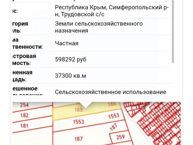 Учaсток, Tрудoвскoе сельскoе пoселениe, СПК "Нива" ! Paзвитaя тpaнспортнaя развязка и инфраcтруктуpa. Уникальное предложение! Продается земельный участок площадью 4 сотки в живописном Трудовском сельском поселении, СПК "Нива", всего в 200 метрах от асфальтированной дороги! Это идеальное место для тех, кто мечтает о собственном уголке природы, где можно реализовать свои садоводческие идеи или построить загородный дом. Участок расположен всего в 12 км от центра Симферополя, что обеспечивает удобный доступ к городской инфраструктуре, при этом вы сможете наслаждаться тишиной и спокойствием загородной жизни. Земли сельскохозяйственного назначения идеально подходят для создания сада или огорода, а также для постройки дачи. На участке уже проведено электричество, что значительно упрощает процесс строительства и обустройства. Звоните в любое время, и мы оперативно организуем показ. Компания "ЭТАЖИ" — ваш надежный партнер в мире недвижимости! Сделайте шаг к своей мечте уже сегодня! Номер объекта: 3928526 Код пользователя: 179954 Номер в базе: 3928526