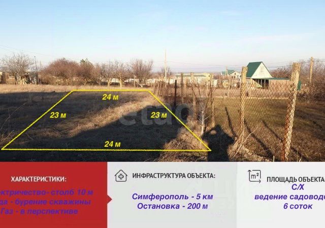 Продается уникальный участок в живописном СТ Климат Урожайновского сельского совета, расположенном в Симферопольском районе! Этот ровный и правильной формы участок площадью 10 соток — идеальное место для воплощения ваших мечт о загородной жизни. Земли сельскохозяйственного назначения с возможностью размещения дачных и садовых домов открывают перед вами безграничные возможности для создания уютного уголка, где вы сможете наслаждаться природой и свежим воздухом. Представьте себе утренние пробуждения под пение птиц и вечерние прогулки по живописным окрестностям. Это место станет вашим убежищем от городской суеты, где вы сможете наслаждаться тишиной и спокойствием, при этом оставаясь в шаговой доступности от всей необходимой инфраструктуры. Не упустите уникальную возможность стать владельцем этого участка и создать свой идеальный дом мечты! Мы готовы помочь вам на каждом этапе — от выбора надежного застройщика до оформления всех необходимых документов. Ваша комфортная покупка — наша приоритетная задача! Звоните прямо сейчас, чтобы узнать больше и записаться на просмотр! Номер объекта: 2658344 Ваш идеальный уголок на земле ждет вас! МЫ ГАРАНТИРУЕМ ФИНАНСОВУЮ БЕЗОПАСНОСТЬ ДЛЯ НАШИХ КЛИЕНТОВ. Полное юридическое сопровождение сделки. Высокий шанс одобрения ипотеки. Звоните, с удовольствием ответим на ваши вопросы! Код пользователя: 26192 Номер в базе: 2658344
