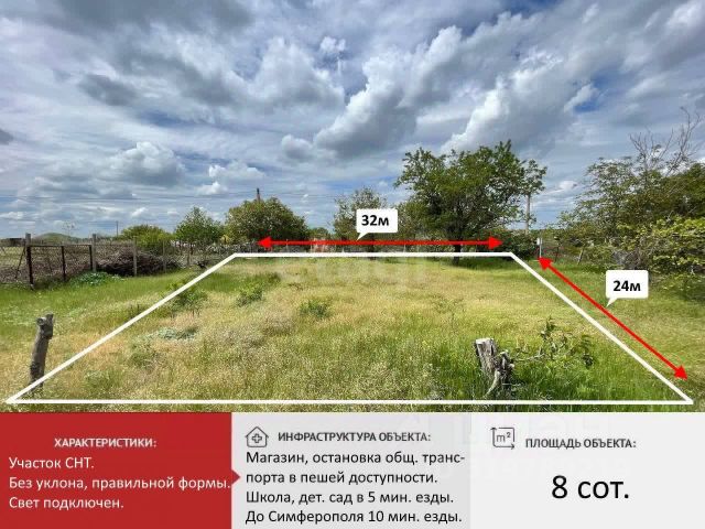 Продажа от собственника ! Третий массив , 10 км от Симферополя, 10-15 мин на авто , также ходит автобус ! Участок в СПК Василёк , 8 соток . Участок правильной , почти квадратной формы , без уклона . Оч рядом с асфальтированной дорогой и конечной остановкой этого массива , 300 метров от участка до конечной . ( удобно добираться , не имея личного авто ). Подключен свет . Есть не капитальная хоз постройка для хранения инструмента + железная бочка для воды . Участок ухожен , убран, Огорожен сеткой ! Назначение земли ( ведение садоводства ) , вы можете построить дом , его оформить , получить прописку . Рядом уже живут соседи в новом доме . Недвижимость эта будет только дорожать , так как активно застраивается массив и развивается инфраструктура вокруг , газ должен Быть в 26 году . Собственник! Российские документы на руках , готовы к сделке ! Участок покупался и проверялся через нотариуса , юридически чистая земля . Кадастровый номер 90:12:170801:5 Торг минимальный . Если не дозвонились , набирайте ещё раз !
