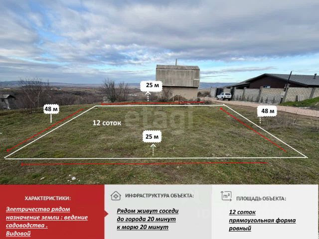 Продается земельный участок в Добровской долине , СТ Мраморное . Участок 12 соток . Назначение земли : сельскохозяйственное , вид разрешенного использования : ведение садоводства. Участок прямоугольной формы. Можно разделить на два. Размеры участка 25/48 Коммуникаций на участке нет. Дом моря 25 км г. Алушта, 15 км до г. Симферополь. Экологически чистый район, рядом лес, озеро и красивые виды. Недалеко расположены Мраморные пещеры. Номер объекта : 10933883. МЫ ГАРАНТИРУЕМ ФИНАНСОВУЮ БЕЗОПАСНОСТЬ ДЛЯ НАШИХ КЛИЕНТОВ. Полное юридическое сопровождение сделки. Высокий шанс одобрения ипотеки. Звоните, с удовольствием ответим на ваши вопросы! Код пользователя: 73209 Номер в базе: 10933883