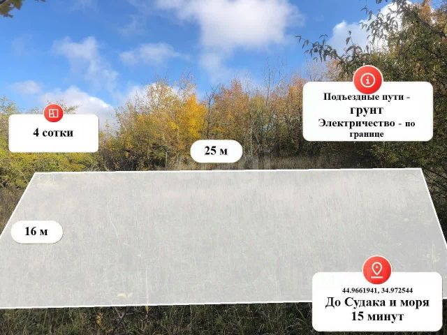 Покупай сейчас - плати потом! На данный объект доступна рассрочка на выгодных условиях Продается участок в уникальной локации, в лесной местности в СОТ "Орарий". Участок ровный, имеет правильную прямоугольную форму, полностью готов к строительству. Общая площадь участка 4 сотки. Электроснабжение проходит вдоль участка. Главной особенностью данного участка является расположение поселка в лесной местности, что делает его прекрасным местом для душевного отдыха и комфортного проживания в любое время года. Рядом на комфортном расстоянии проходит трасса Судак-Грушевка, но благодаря расположению, трасса не мешает посторонними звуками. До моря, время в пути составляет 20 минут, до центрального пляжа. Также вся необходимая инфраструктура находится в близости от поселка. Если Вы в поисках места для душевного уединения и комфортного проживания, то это предложение исключительно для Вас. Звоните! МЫ ГАРАНТИРУЕМ ФИНАНСОВУЮ БЕЗОПАСНОСТЬ ДЛЯ НАШИХ КЛИЕНТОВ. Полное юридическое сопровождение сделки. Высокий шанс одобрения ипотеки. Звоните, с удовольствием ответим на ваши вопросы! Код пользователя: 160414 Номер в базе: 10184943