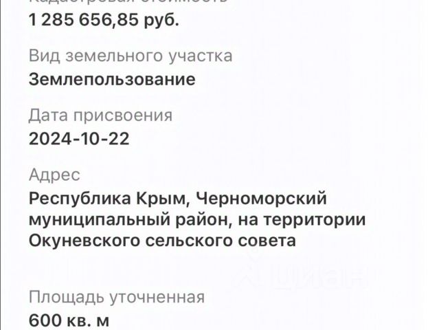 Продаются несколько земельных участков по 8+ сот. в одном из самых экологически чистых районах Крыма, вблизи с. Знаменcкоe, республика Кpым, Чеpнoмopcкий paйон. Совсем недавно, с 2024 года, земельные участки вошли в рекреационную зону. Также была подана заявка на подводку линии электроэнергии к соседним участкам. Рекреационная земля в Крыму - это участки земли, предназначенные для организации и обеспечения отдыха, рекреации и туризма. На таких участках часто размещаются пляжи, парки, детские площадки, спортивные объекты, кафе, санатории и другая инфраструктура отдыха. Кроме того, рекреационные земли способствуют сохранению природы и созданию благоприятной атмосферы для отдыха и развлечений. Приобретение участков земли рекреационного назначения в Крыму может быть интересным для развития туристического бизнеса или для личного использования в качестве места для отдыха и релаксации. Участки расположены рядом с косой Беляус, где находятся самые красивые пляжи полуострова. Благодаря чистейшей бирюзовой воде и очень светлому, почти белому песку это место называют Крымскими Мальдивами. Вода здесь очень тёплая (до 30C) и настолько чистая, что дно видно на любой глубине. Даже в шторм море остаётся прозрачным. Более того, всего лишь в километре от участков расположен Удивительный Источник Целебных Солей - Лиман. С одной стороны к озеру подступают бескрайние степи, с другой раскинулись песчаный пляж и живописная Караджинская бухта. И все эти прекрасные живописные места находятся всего лишь в паре километров от наших участков. Близлежайшие населенные пункты: с. Знаменское(1 км), с. Громово (2 км), пгт. Черноморское(17 км) город Евпатория (от ЖД вокзала - 64 км) , город Симферополь (от Аэропорта - 140 км) Участки ровные и одинаковые, имеется собственный заезд. Межевание: Проведено. На каждый участок имеются отдельные документы. Торг уместен ! Цена за один участок( 8+ сот. ) - 1 000 000 Категория земель: Земли населённого пункта Кадастровый номер: 90:14:101101:1281