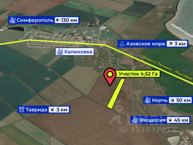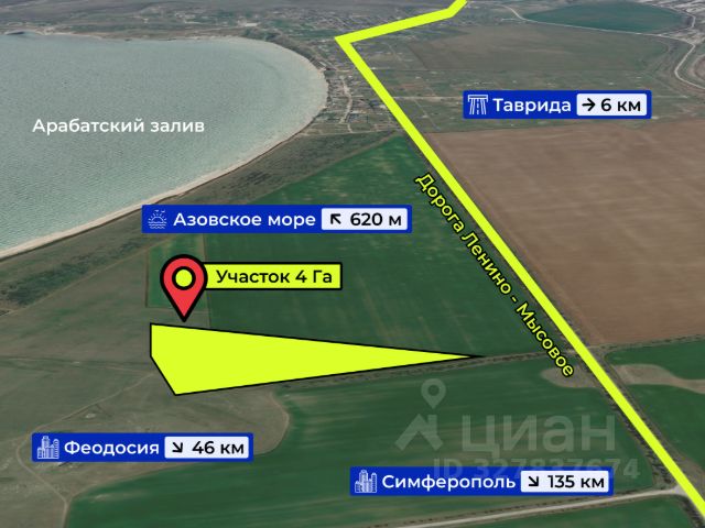 Земельный участок в тихом курортном районе на Азовском побережье Крыма Площадь 4 Га Кадастровый номер: 90:07:000000:758 Выгодное расположение и инфраструктура: — Рядом села Семеновка (3 км) и Щелкино (10 км). — Всего в 15 км — знаменитый Казантипский заповедник и мыс Казантип. — Участок имеет удобный подъезд по асфальтированной дороге и граничат с населенным пунктом. — Село Калиновка полностью газифицировано. — Земля ухожена и обрабатывается. Перспективы и инвестиционный потенциал: — Идеальное место для создания кемпинга, глэмпинга, дачного или коттеджного поселка. Соседние территории уже подготовлены под СНТ. — Регион активно развивается: уже сегодня наблюдается постоянный поток туристов На Петербургском экономическом форуме-2024 подписано соглашение о строительстве в Ленинском районе масштабного туристического кластера стоимостью 110 млрд рублей. Проект включает отели, аквапарк, спортивный комплекс, объекты инфраструктуры (школу, детсады, поликлинику) и займет 100 Га. Это гарантирует стремительный рост цен и привлекательности всей округи! Для получения дополнительной информации - готовы ответить на все вопросы!!