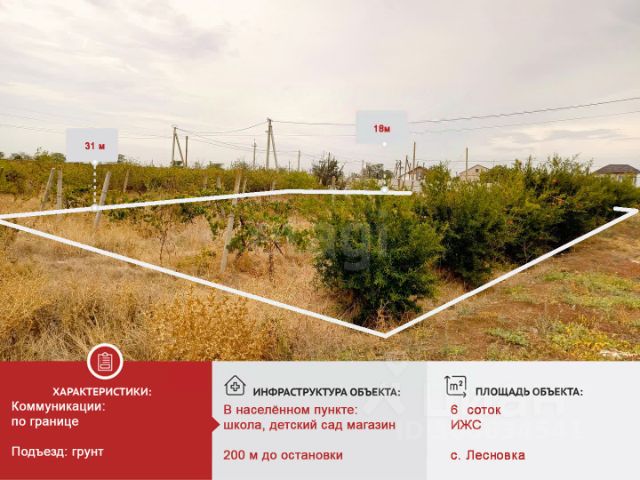 | участок под строительство жилого дома | ДО ЦЕНТРА 2 км. | ИПОТЕКА ВОЗМОЖНА. Продается земельный участок в селе Лесновка (Саки) Площадь: 6 соток. Назначение земельного участка: ведение садоводства. Вдоль массива асфальтированная дорога, подъезд к участку - 50 м грунтовой дороги. Коммуникации: на массив ведут водопровод, электричество в 100 м, для канализации - выгребная яма. Локация: до школы и детского сада 1,2 км, до магазинов разного назначения 1,5 км, по соседству уже строится дом, очень развитое село, рядом с городом Саки, до него 2 км Количество собственников: одинДополнительно оплачивается комиссия покупателя в случае подбора объектов недвижимости.Объект 102771