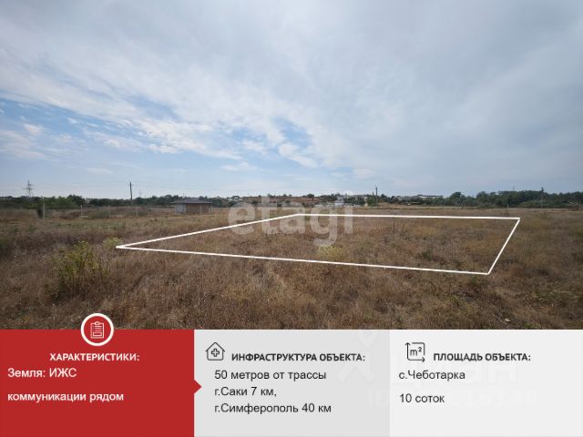 Продается земельный участок в селе Чеботарка, Сакский район! Участок 10 соток для индивидуального строительства (ИЖС). Участок расположен на улице Согласия в новом жилом массиве села, в экологически чистой зоне района, недалеко от леса и озера. Территория с ровным рельефом, прямоугольной формы, подъездной путь грунтовка, до трассы на Евпаторию 100 м. Удобная локация и транспортная развязка, в пешей доступности необходимая инфраструктура, до города Саки около 5 км, до моря и широкого песчано-галечного пляжа 7 км. В селе хорошее, регулярное автобусное сообщение с городами Саки, Евпатория, и с соседними населёнными пунктами. Соседи строятся. Коммуникации по границе участка. Доп. описание: водоснабжение: централизованный Наша комиссия 59000 р.+1% от стоимости объекта, но не менее 70000 р. МЫ ГАРАНТИРУЕМ ФИНАНСОВУЮ БЕЗОПАСНОСТЬ ДЛЯ НАШИХ КЛИЕНТОВ. Полное юридическое сопровождение сделки. Высокий шанс одобрения ипотеки. Звоните, с удовольствием ответим на ваши вопросы! Код пользователя: 92233 Номер в базе: 3568920