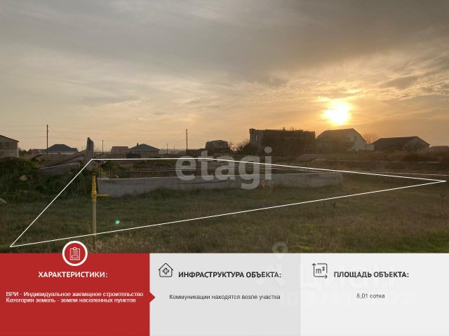 Продается участок для строительства 8 соток. ИЖС. Кадастровый номер 90:11:210102:262 Участок частично огорожен сеткой рабицей, прямоугольной формы, есть саженцы фруктовых деревьев. На участке есть строение, с фундаментом, стены выгнаны, подведено электричество на участке есть вода и газ проходит рядом. Участок расположен в границах населенного пункта. Есть соседи живущие рядом и соседи которые активно застраиваются. Рядом с участком проходит Красноярское шоссе и трасса Таврида. Школа, Детский сад, аптека и магазины находятся в центре села. Участок подходит для жизни, капиталовложения и инвестиций. Документы РФ готовы к сделке. Номер объекта: #1/547541/23345