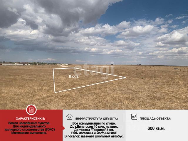 Продаётся земельный участок с.Лиманное, находится на берегу одного из западных заливов озера Сасык, прекрасное месторасположение, до центра г. Евпатория 7 км. До моря с чистейшими пляжами 5 км. Площадь участка 6,75 соток. категория земель: Земли населенных пунктов. виды разрешённого использования: индивидуальное жилищное строительство. кадастровый номер: 90:11:000000:5303 Отличная инвестиция! Прекрасное место для жизни. Все коммуникации проходят вдоль участка ГАЗ, СВЕТ, ВОДА. Произведено грейдирование дороги, рядом с домом автобусная остановка, заправка, магазин, кафе, база отдыха есть уютные беседки для рыбалки и отдыха, где открывается красивый вид на озеро Сасык-Сиваш. Дополнительная информация по телефону, показ в удобное время для Вас. Свободная продажа, документы РФ. Продажа БЕЗ комиссии для Покупателя