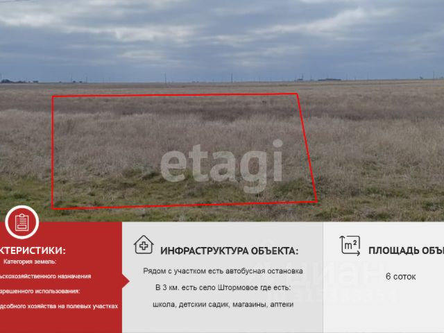 Продается участок площадью 6 соток, в 3 км. село Штормовое. Земля не обработана. Категория: земли сельского хозяйственного назначения. Вид разрешенного использования:ведение личного подсобного хозяйства на полевых участках. В 5 минутах езды с. Штормовое, где есть продуктовые магазин, аптека, школа и детский садик. Город Евпатория в 19 км., в 5 км. Черное море, рядом есть, автобусная остановка. Звоните прямо сейчас ! МЫ ГАРАНТИРУЕМ ФИНАНСОВУЮ БЕЗОПАСНОСТЬ ДЛЯ НАШИХ КЛИЕНТОВ. Полное юридическое сопровождение сделки. Высокий шанс одобрения ипотеки. Звоните, с удовольствием ответим на ваши вопросы! Код пользователя: 167729 Номер в базе: 5803738