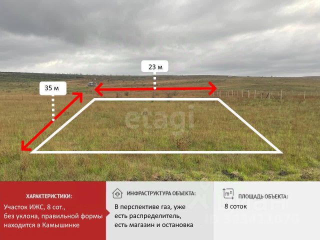 Уникальное предложение! Прекрасный участок в селе Камышинка! Предлагаем вам участок площадью 8,05 соток в живописном селе Камышинка! Это идеальное место для строительства вашего загородного дома или дачи. Участок располагается в тихом и спокойном районе, окружённом природой, что создаёт атмосферу уединения и гармонии. Здесь вы сможете наслаждаться свежим воздухом, тишиной и красотой природы. В ближайшей перспективе планируется подключение газа, что добавит комфорта и удобства вашему будущему жилью. Село Камышинка предлагает все необходимые удобства для комфортной жизни: магазины, школы, детские сады и медицинские учреждения находятся в шаговой доступности. Хорошая транспортная доступность позволяет быстро добраться до ближайших городов и населённых пунктов. Вы сможете легко организовать досуг и провести время с семьёй на природе, наслаждаясь прогулками и активными видами отдыха. Участок готов к сделке! Мы предлагаем удобные условия оплаты: возможна как полная оплата, так и ипотека. Наша команда профессионалов поможет вам оформить все необходимые документы и ответит на любые ваши вопросы. С нами вы можете быть уверены в качестве услуг и надежности сделки. Компания "Этажи" имеет богатый опыт на рынке недвижимости и заботится о своих клиентах. Мы поможем вам найти идеальный участок, который станет вашим уютным уголком на земле. Не упустите возможность стать владельцем этого замечательного участка в селе Камышинка! Номер объекта: 10230684 МЫ ГАРАНТИРУЕМ ФИНАНСОВУЮ БЕЗОПАСНОСТЬ ДЛЯ НАШИХ КЛИЕНТОВ. Полное юридическое сопровождение сделки. Высокий шанс одобрения ипотеки. Звоните, с удовольствием ответим на ваши вопросы! Код пользователя: 142214 Номер в базе: 10230684