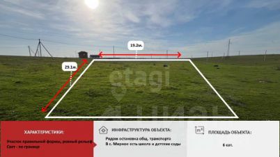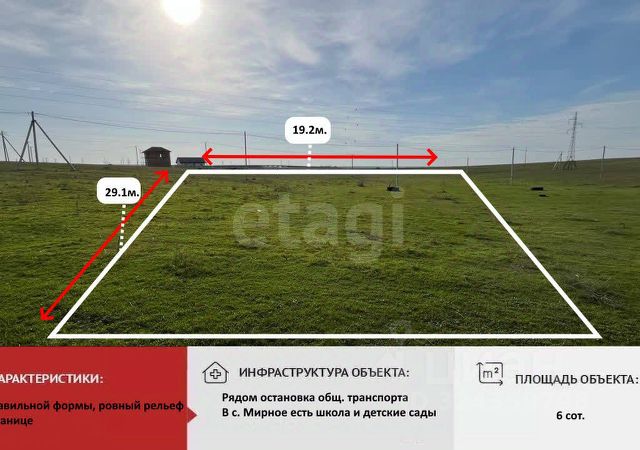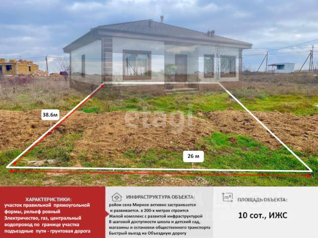 Участок в одном из самых востребованных сейчас районов! Предлагаем приобрести 6 соток ИЖС в с. Мирное. Участок ровный, прямоугольной формы. Отлично подойдет под строительство. Тихое, спокойное место. Соседи уже давно проживают. До автобусной остановки метров 50. Газ подведен к границе участка . Имеется лицевой счет на электроэнергию. Хорошие подъездные пути, грунтовая дорога 20 мм, далее везде асфальт. Груши, яблони, черешня скучают без хозяина! Такое приобретение - это отличные инвестиции! Цена на участки в этом районе постоянно растет. Остались вопросы, звоните! Проведём показ в кратчайший срок! Номер объекта 2749677 МЫ ГАРАНТИРУЕМ ФИНАНСОВУЮ БЕЗОПАСНОСТЬ ДЛЯ НАШИХ КЛИЕНТОВ. Полное юридическое сопровождение сделки. Высокий шанс одобрения ипотеки. Звоните, с удовольствием ответим на ваши вопросы! Код пользователя: 94958 Номер в базе: 2749677