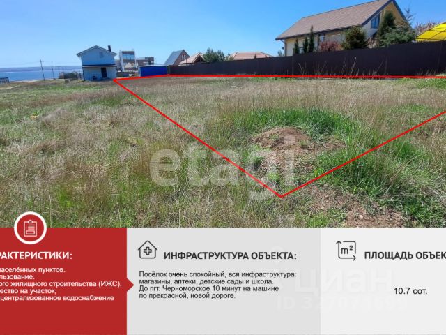 Продается земельный участок 9,5 соток в селе Снежное Межводненского сельского поселения Черноморского района. К селу подходит асфальтированная дорога. Село полностью газифицировано, на участке свет, вода, рядом колодец с чистейшей водой. На участке находится небольшой дом под снос, фундамент хороший, подойдет для строительства нового дома. Участок выходит с одной стороны на главную улицу, с другой на трассу, очень удобный подъезд. Участок большой, при необходимости можно поделить. С земельного участка открывается очень красивый вид на море и Панское озеро, дорожная развязка хорошая, доступно все, что нужно для жизни. Документы РФ готовы к сделке, по запросу предоставлю видеообзор. МЫ ГАРАНТИРУЕМ ФИНАНСОВУЮ БЕЗОПАСНОСТЬ ДЛЯ НАШИХ КЛИЕНТОВ. Полное юридическое сопровождение сделки. Высокий шанс одобрения ипотеки. Звоните, с удовольствием ответим на ваши вопросы! Код пользователя: 182478 Номер в базе: 3403559