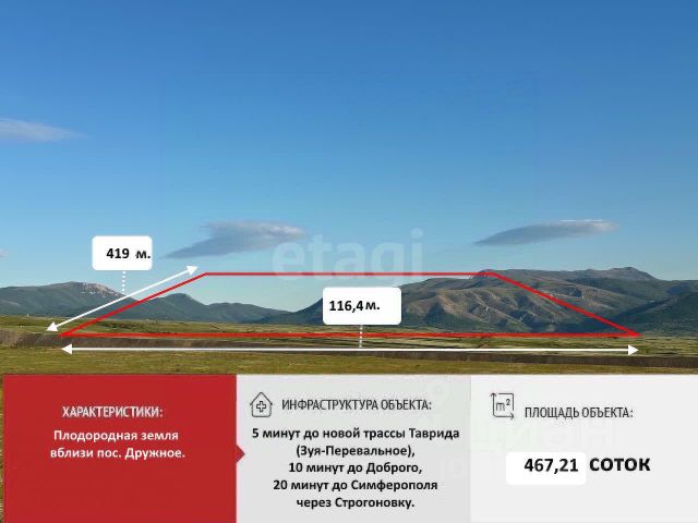 Земельный участок сельхозназначения Ваш ключ к прибыльному бизнесу! Предлагается к продаже участок в живописном районе вблизи с. Дружное, идеально подходящий для реализации разнообразных коммерческих проектов. Благодаря плодородной почве и удобному расположению, этот участок открывает широкие возможности. для: выращивания сельскохозяйственных культур (зерновые, овощи, фрукты, ягоды): организуйте прибыльное растениеводство, используя современные технологии и методы; животноводства: создайте ферму для разведения крупного рогатого скота, птицы или других животных; организации агротуризма: создайте уникальное место для отдыха и развлечений, предлагая гостям возможность познакомиться с сельской жизнью. 467.21 соток плодородной земли. Всего 150 метров до асфальта и электричества легкое подключение к комфорту! Удобная транспортная доступность: 5 минут до новой трассы Таврида (Зуя-Перевальное), 10 минут до Доброго, 20 минут до Симферополя через Строгоновку. Добираться легко как на авто, так и на автобусе. Участок на небольшом склоне с живописным видом на долину и горы. Тихий район, свежий воздух идеальное место для отдыха от городской суеты. Готовы к быстрой сделке! Звоните сегодня, чтобы начать строить свою мечту! Номер объекта: 9778968 МЫ ГАРАНТИРУЕМ ФИНАНСОВУЮ БЕЗОПАСНОСТЬ ДЛЯ НАШИХ КЛИЕНТОВ. Полное юридическое сопровождение сделки. Высокий шанс одобрения ипотеки. Звоните, с удовольствием ответим на ваши вопросы! Код пользователя: 185552 Номер в базе: 9778968